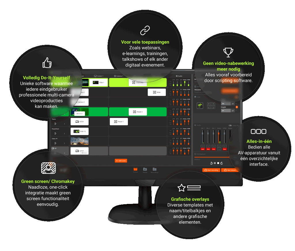Met één druk op de knop automatiseer je de volledige regie en focus je volledig op de inhoud, terwijl de software de techniek verzorgt.