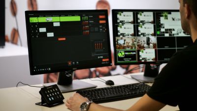 Everything is included, from high-quality bi-color LED studio lamps with tripods and professional lavalier microphones to different monitors for operating the software or the multi-viewer. In addition, a 27-inch look-back monitor is mounted under each camera. The look-back monitor can be used to see yourself on the screen while presenting and still look straight into the camera. You can also show the Teams or Zoom participants during the live stream, or you can use it to see your speaker notes.