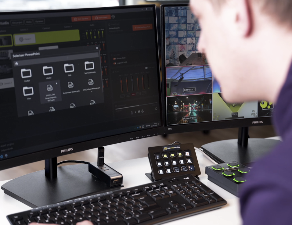 StudioAssist is GetyourStudio's own production software — developed specifically for corporate in-house video studios. The software integrates all AV equipment — cameras, audio, lighting, and media sources — into a single, clear interface. Whether it's multi-camera webinars, e-learning recordings, live podcasts, or hybrid events: StudioAssist enables broadcast-quality production with no AV expertise required. Proprietary software developed by GetyourStudio, based in Utrecht, the Netherlands.