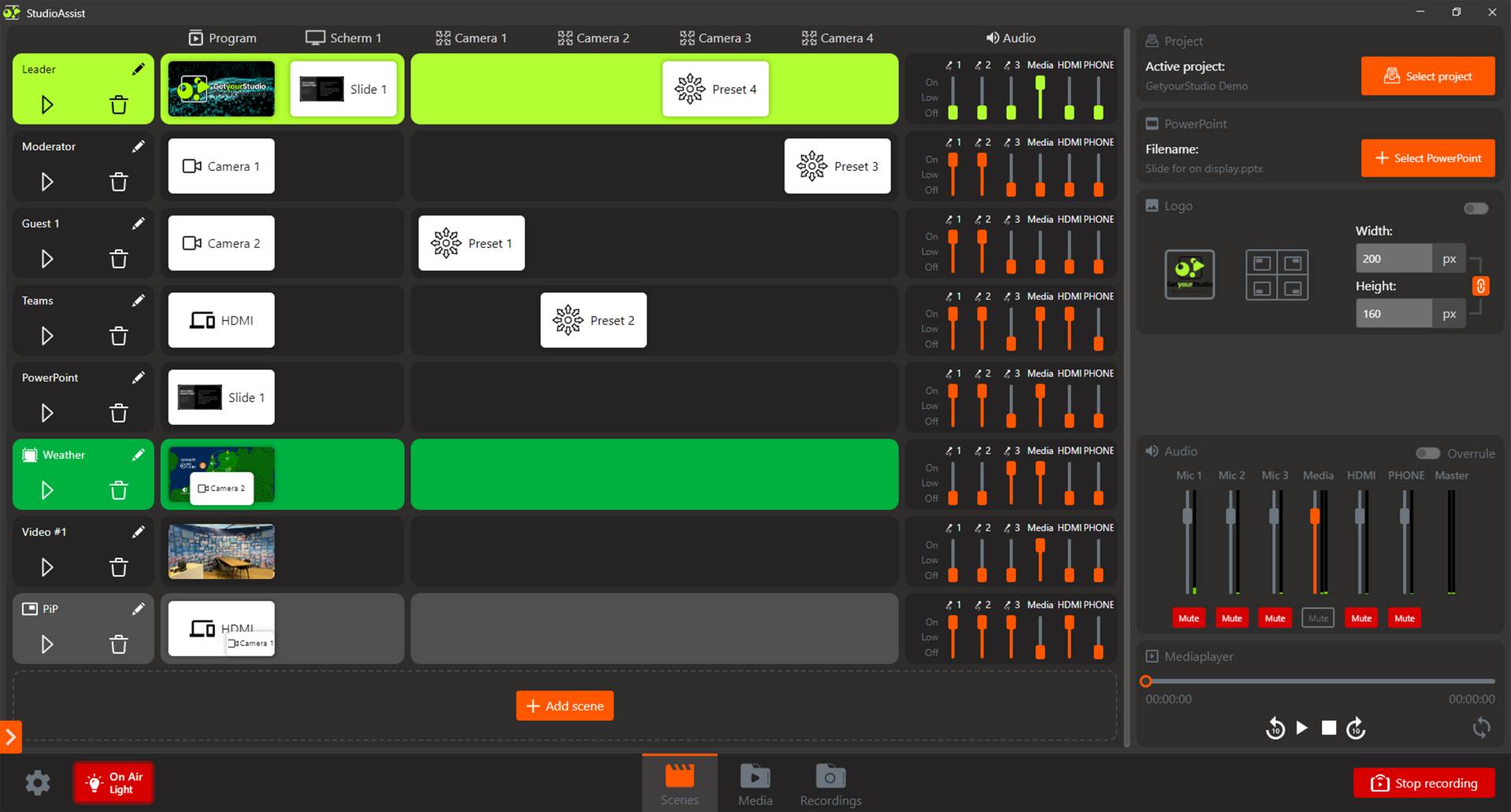 Using our integrated script rundown, creating your own videos is quite simple. With a script, you can instantly access all the recording's settings and media without looking or being surprised. You may swiftly move between different camera views, PowerPoints, video files, and other types of material in this way. One person can control the entire stage while the recording is taking place. Even the presenter themselves can do that for straightforward presentations. A button press can start certain scenes and settings.